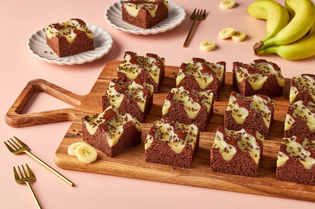 Beim Schoko-Bananen-Kuchen von Dr. Oetker Professional trifft eine fruchtige Bananen-Füllung auf feinen Schoko-Kuchen.