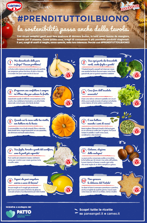 Con #PrendiTuttoilBuono cameo raccoglie dieci piccole ma efficaci idee, tra consigli e ricette, per non sprecare il cibo che abbiamo a casa, utilizzando i prodotti freschi nella loro interezza e al contempo consumando prodotti stagionali in modo da ridurre la nostra impronta ambientale. L’azienda, facendo leva sulla lunga tradizione nello sviluppo delle amatissime ricette Paneangeli e cameo, e su una forte sensibilità verso le tematiche ambientali, mette in campo i suoi esperti pasticcieri in questa nuova sfida: cucinare, prendendo tutto il buono.