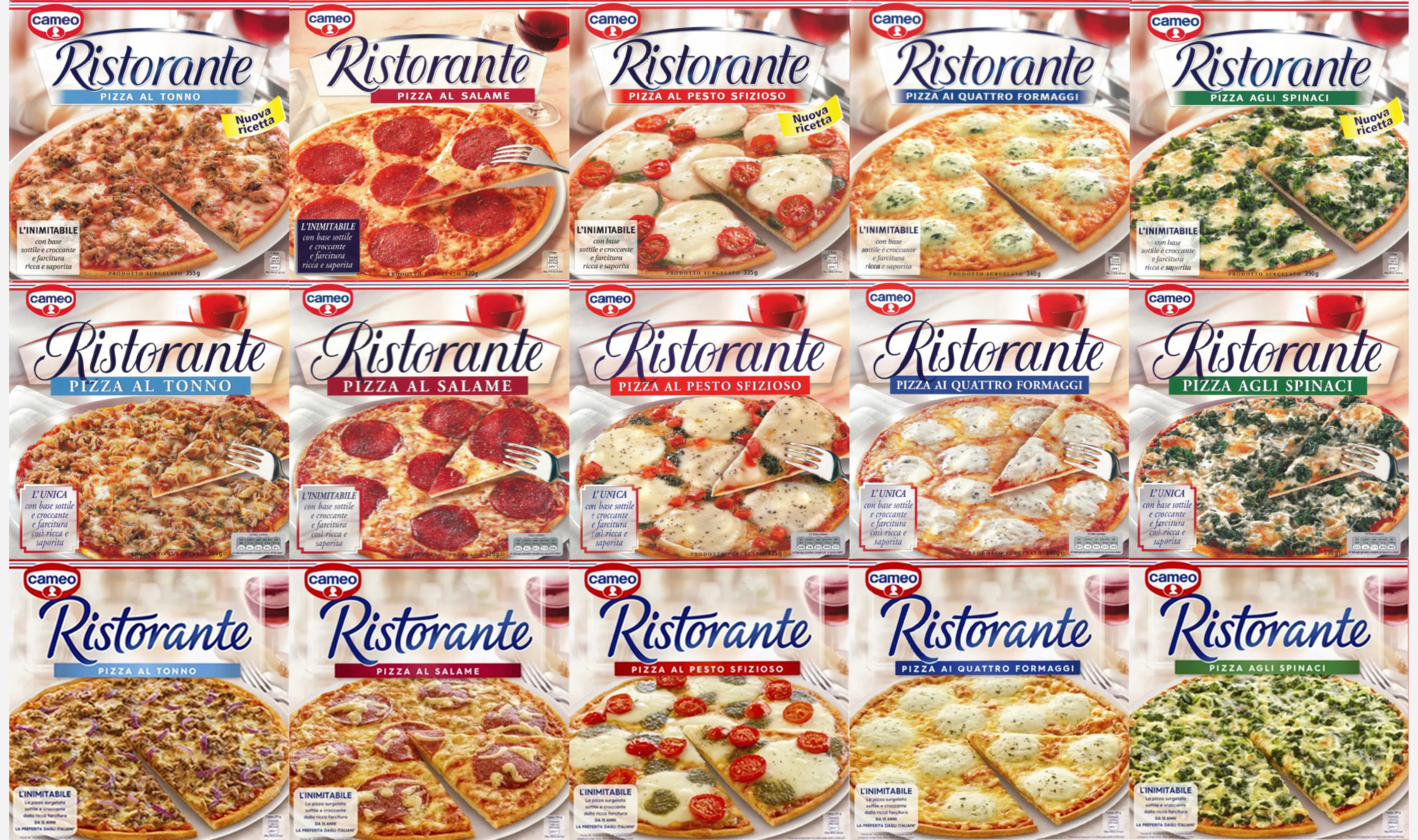 L'evoluzione della confezione di Pizza Ristorante, dal 2005 ad oggi. Pizza Ristorante al Salame è la referenza più venduta in Italia.